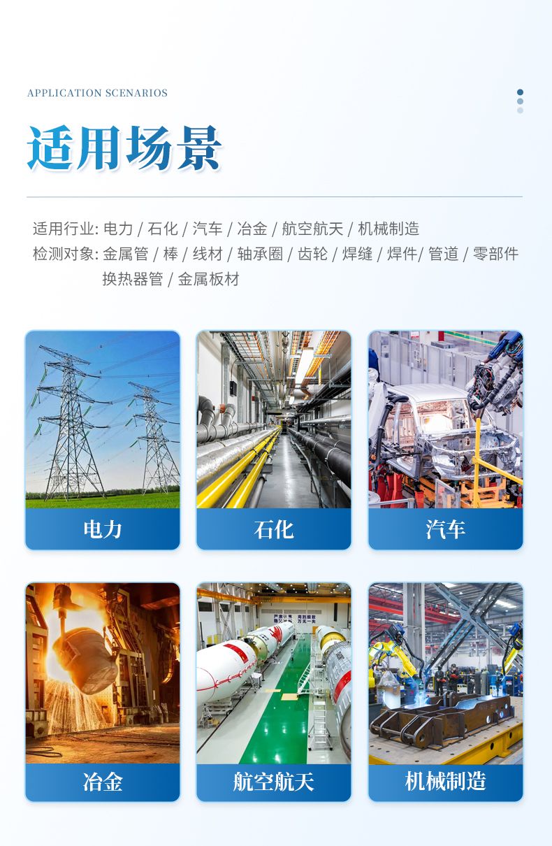 89LET由于功能多,应用领域广,对叶片、轮毂等构件的表面进行检测,用于一般缺陷评估;可检测孔内侧的裂纹;各种金属零部件和铁磁性焊缝裂纹检测;导体上非导电性涂层或镀层的厚度测量;检测薄板的厚度变化;检测在役的各种非铁磁性管子,包括裂纹、壁厚、腐蚀等;检测复合材料层间间隙腐蚀,如对飞机多层结构、铝蒙皮和机身机翼接头等的检测;材质分选。