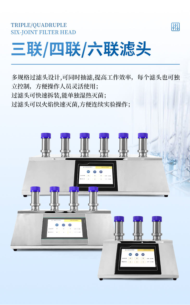 7.多规格过滤头设计,可同时抽滤,提高工作效率,每个滤头也可独立控制,方便操作人员灵活使用;