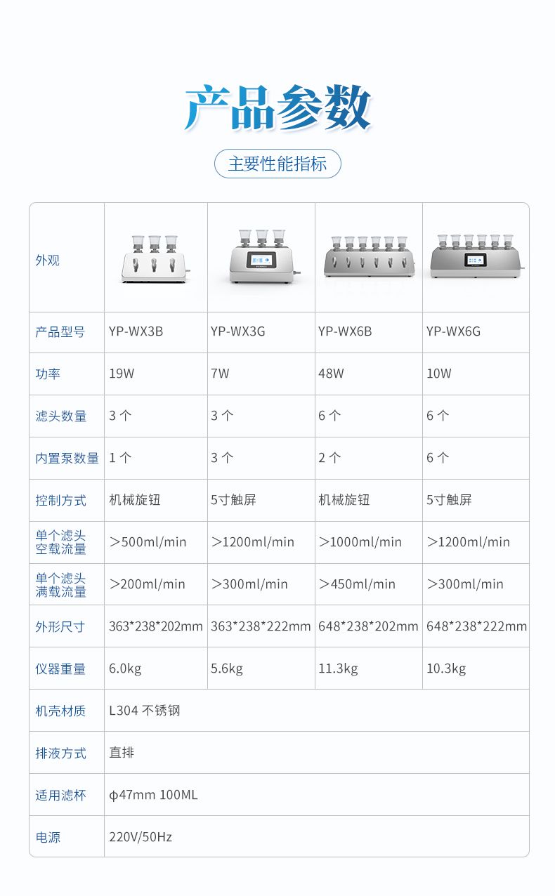 1.内置隔膜泵设计:采用2个高性能隔膜泵,噪音低、性能稳定,无需外接抽滤瓶,样品过滤后可直接排液,提高操作便捷性。