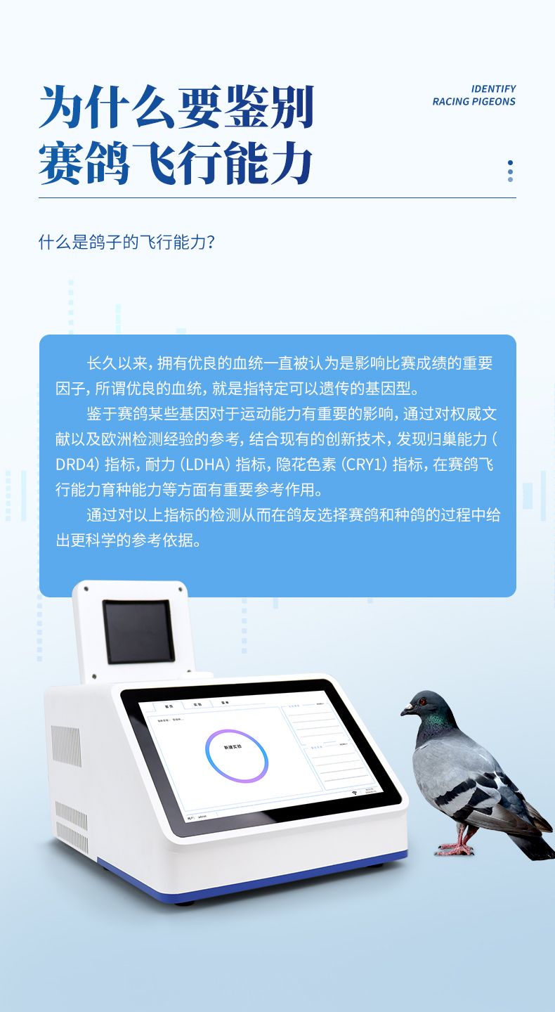 长久以来,拥有优良的血统一直被认为是影响比赛成绩的重要因子,所谓优良的血统,就是指特定可以遗传的基因型。鉴于赛鸽某些基因对于运动能力有重要的影响,通过对权威文献以及欧洲检测经验的参考,结合现有的创新技术,发现归巢能力指标,耐力指标,隐花色素指标,肌肉生长抑制素指标,羽角蛋白指标,智力,阴雨天定向在赛鸽飞行能力育种能力等方面有重要参考作用,通过对以上指标的检测从而在鸽友选择赛鸽和种鸽的过程中给出更科学的参考依据。