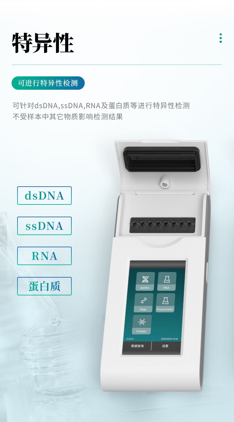 特异性---可针对dsDNA,ssDNA,RNA及蛋白质等进行特异性检测,不受样本中其它物质影响检测结果