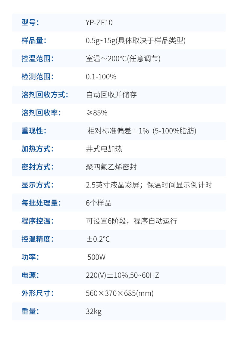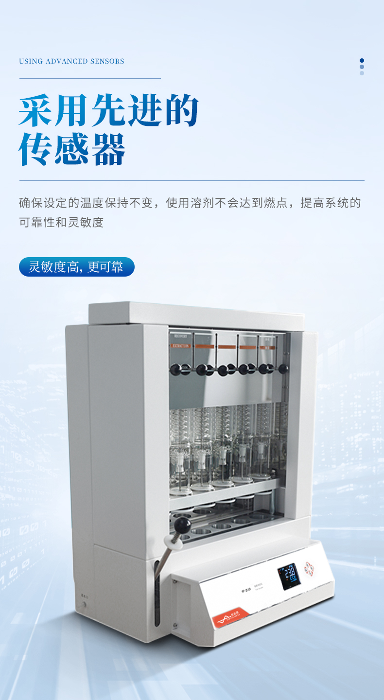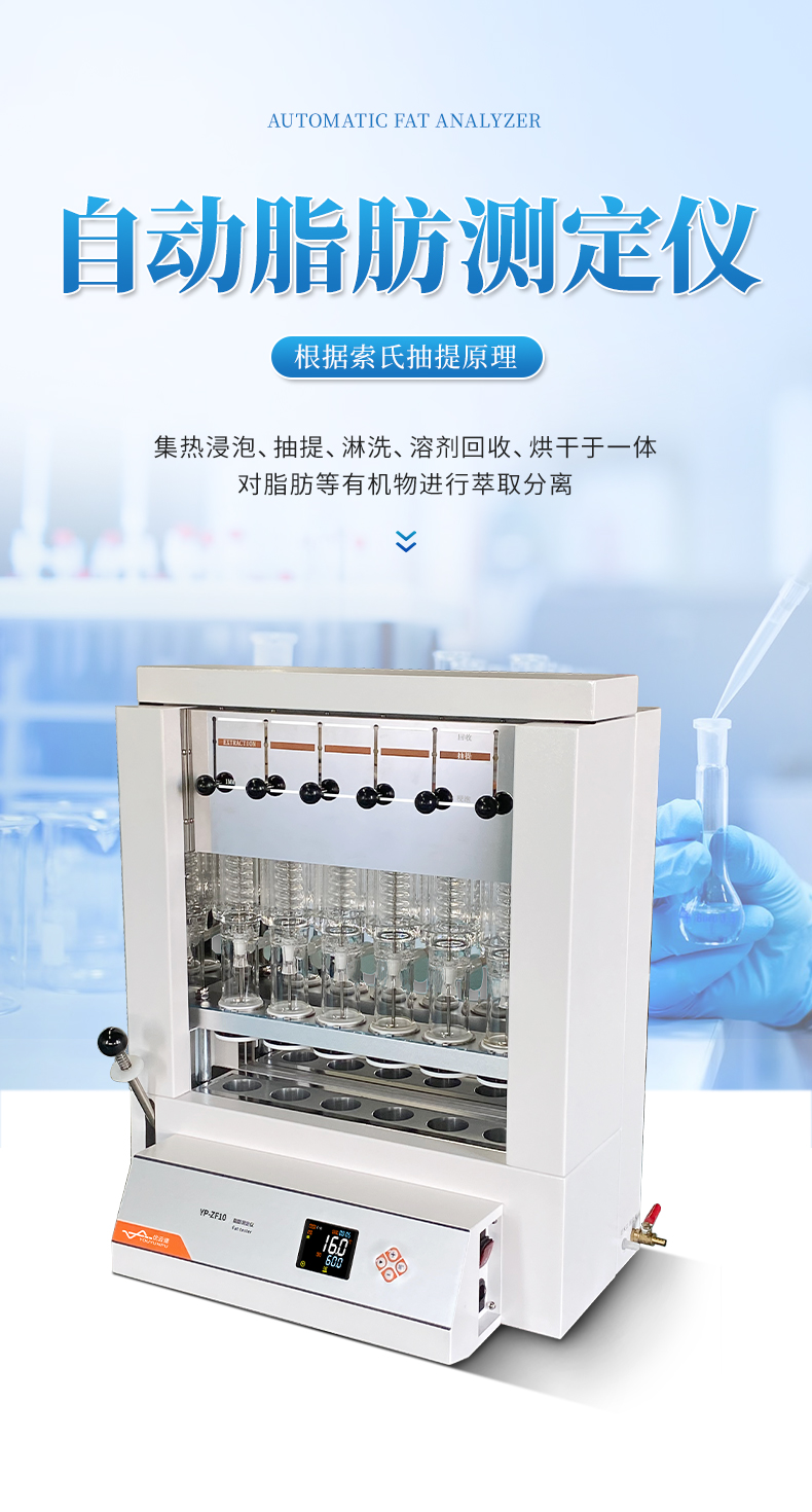 自动脂肪测定仪(索氏提取仪)是根据索氏抽提原理,集热浸泡、抽提、 淋洗、溶剂回收、烘干于一体,对脂肪等有机物进行萃取分离的仪器。仪器采用了自 动控温、全封闭井式电加热形式,使仪器加温更为均匀,安全可靠,并具有良好的密 封设施,从而达到快速准确的目的;最大限度降低溶剂用量,自动回收溶剂,节省分 析成本。具有设计合理、操作简单、精确度高、性能稳定、重现性 好、省力、省时等优点。