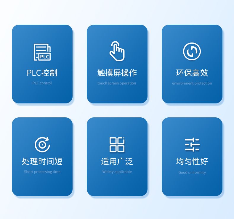 【效率高】:处理时间短,反应速率高,处理均匀性好;【节能、环保】:全程干燥的处理方式,不消耗水资源、无需添加化学药剂、不产生污染。