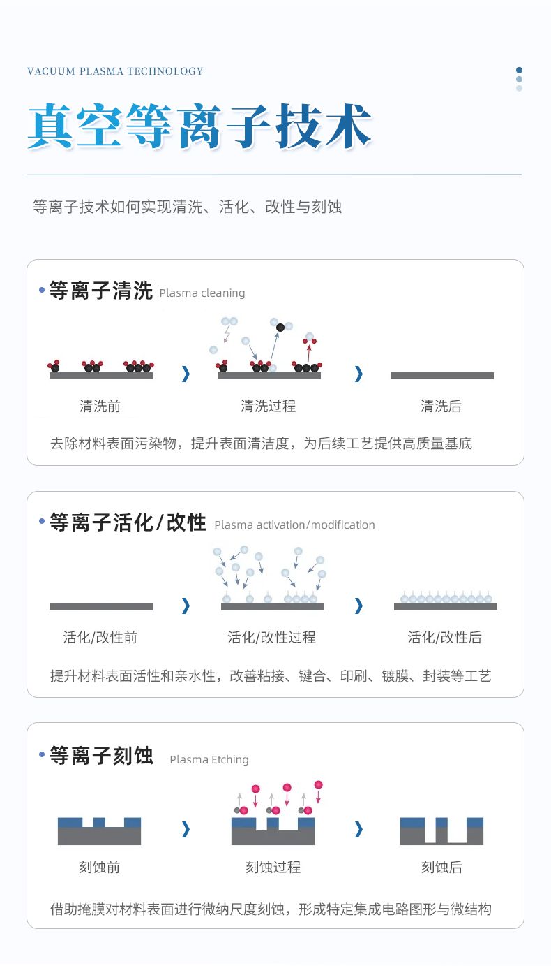 对气体施加足够的能量使之离化便成为等离子状态。等离子体的"活性"组分包括:离子、电子、活性基团、激发态的核素(亚稳态)、光子等。等离子体表面处理仪就是通过利用这些活性组分的性质来处理样品表面,从而实现清洁、改性、